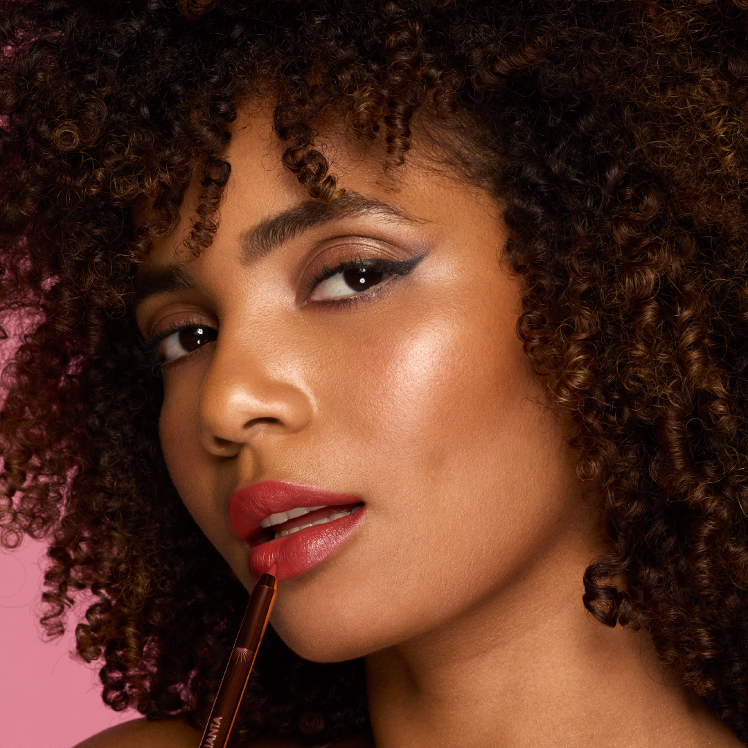 Comienza delineando tus labios con el lápiz ultrapreciso Speak Easy. Empieza en el centro del labio superior y sigue cuidadosamente su línea natural hasta las comisuras. Repite el mismo proceso en el labio inferior.