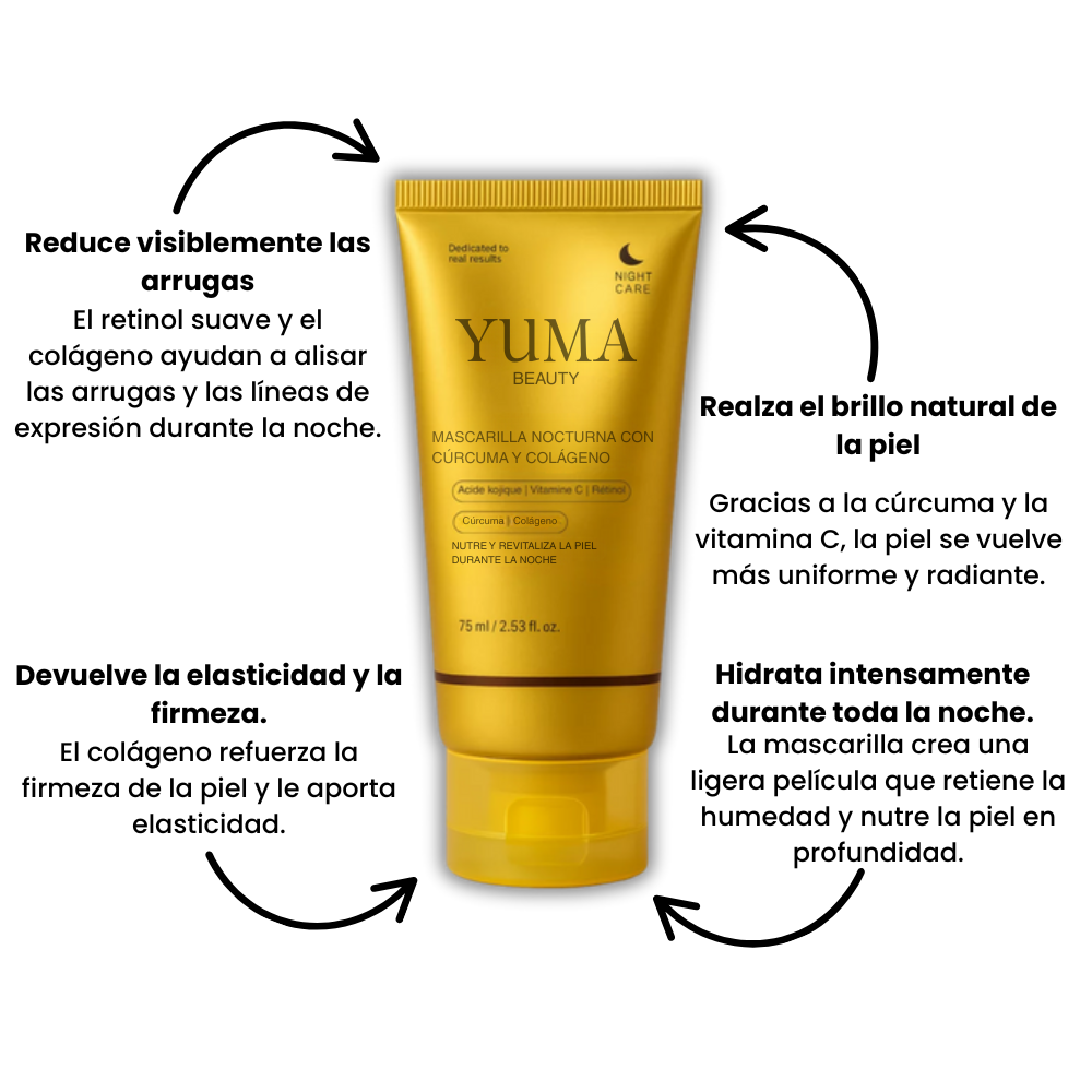 El colágeno reafirma la piel, la cúrcuma y la vitamina C iluminan el tono, mientras que el retinol actúa suavemente alisando las arrugas.